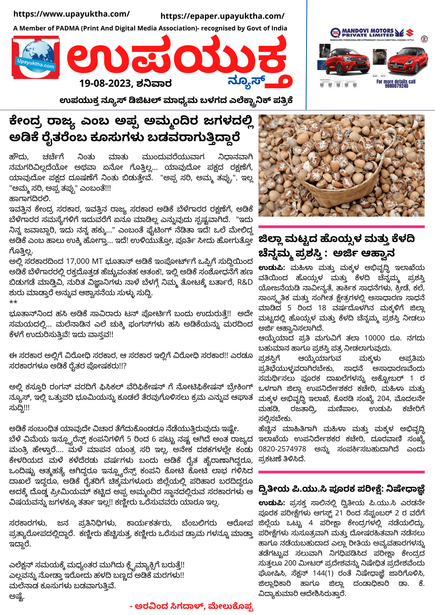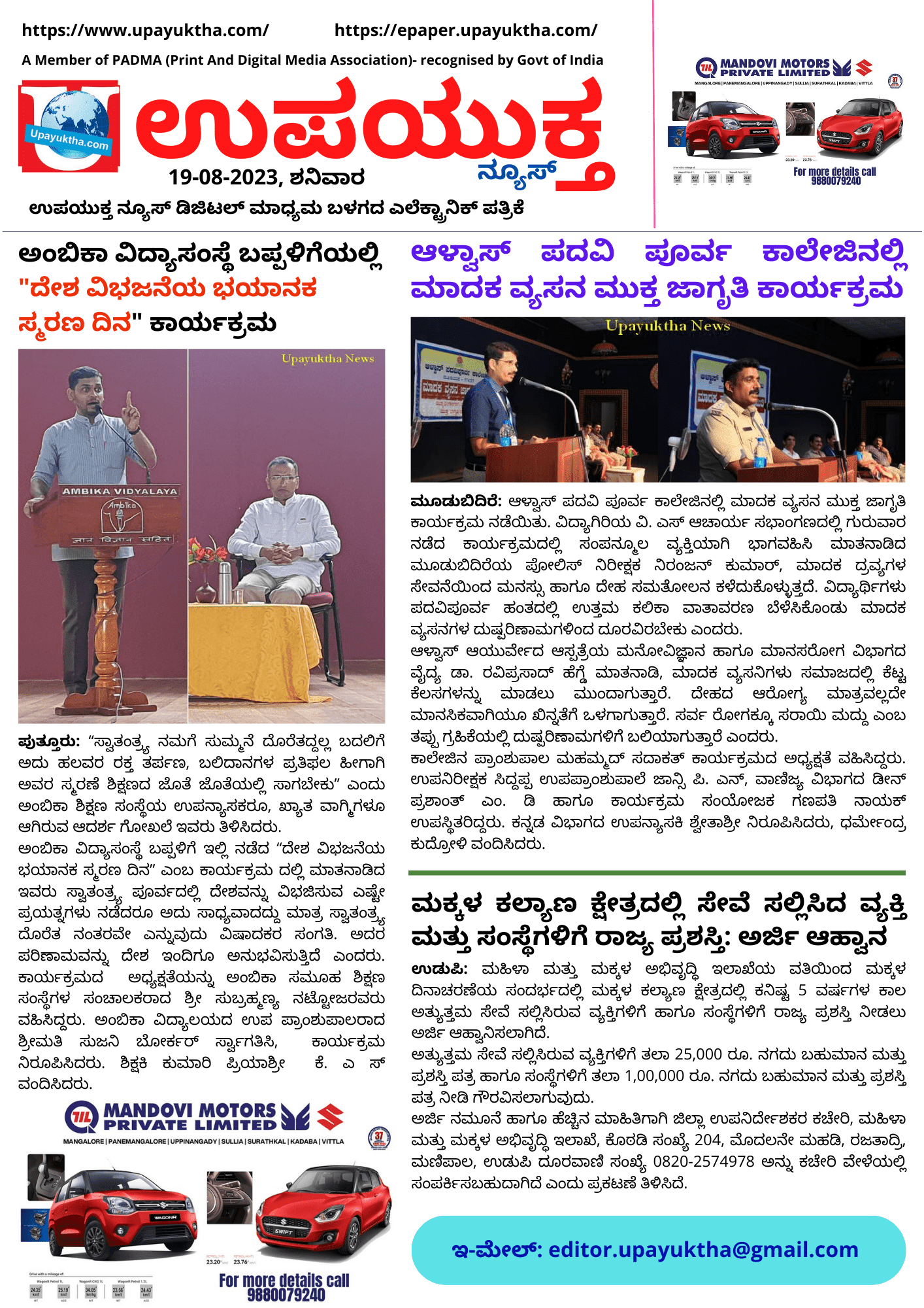 ಉಪಯುಕ್ತ ನ್ಯೂಸ್ ಇ-ಪೇಪರ್, 19 ಆಗಸ್ಟ್ 2023, ಶನಿವಾರ