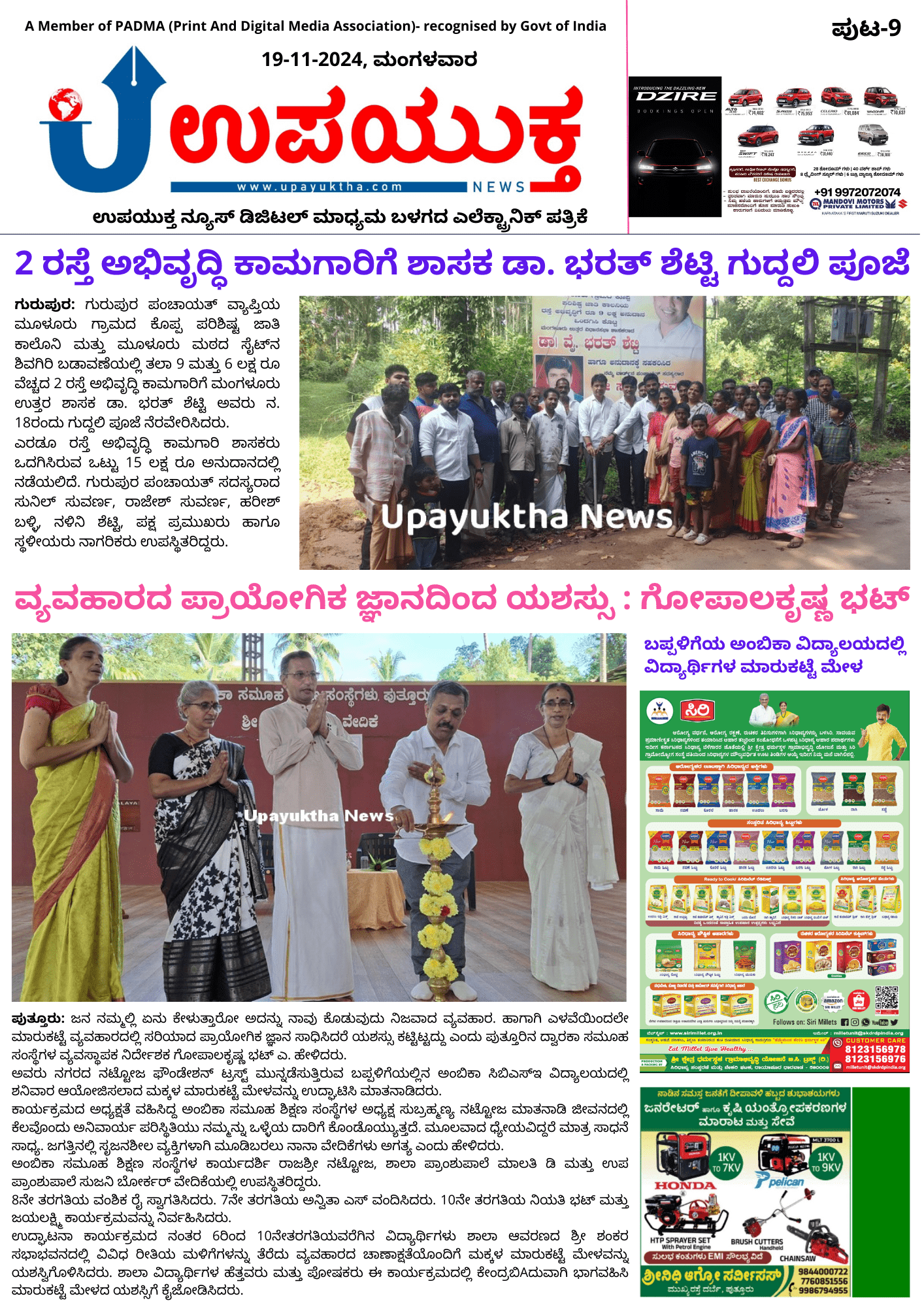 ಉಪಯುಕ್ತ ನ್ಯೂಸ್ ಇ-ಪೇಪರ್, 19 ನವೆಂಬರ್ 2024, ಮಂಗಳವಾರ